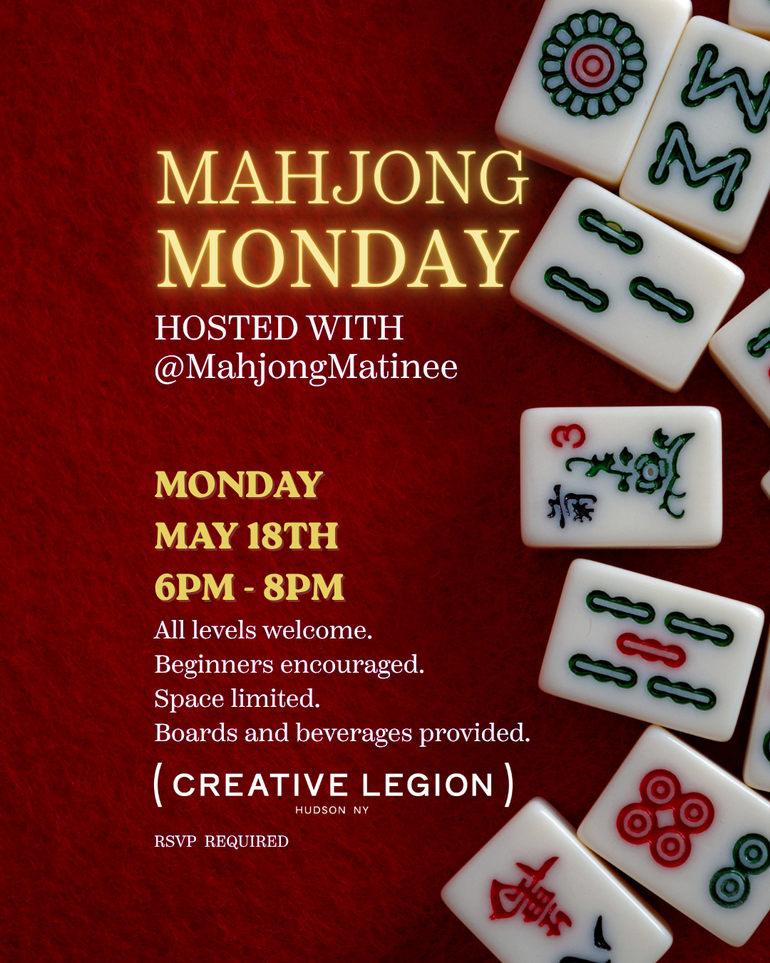 Join us for Mahjong Monday, a casual evening of gameplay hosted with @MahjongMatinee. All levels welcome — if you've never played, even better. We'll get you up to speed.